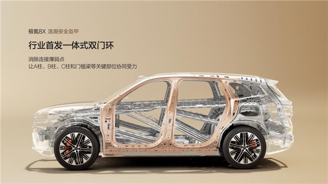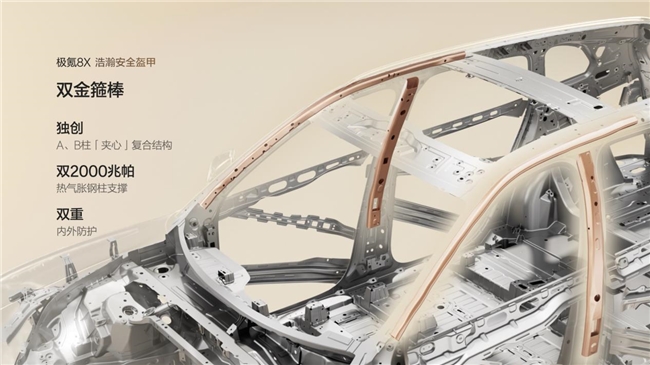极氪8X在安全配置上展现了较高规格。车身方面,行业首发双门环+双金箍棒设计,配合电池专属防护体系,构成了物理层面的“浩瀚安全盔甲”。主动安全上,由G-AEB和G-AES组成的防护系统,与中汽中心认证的4S级AI数字底盘协同工作。